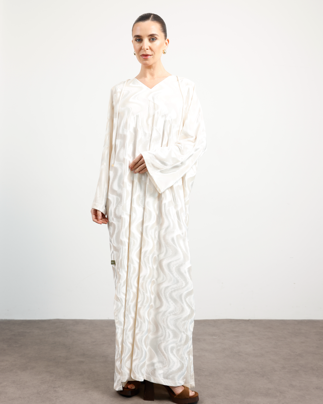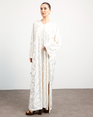 Crafted from premium velvet featuring a tonal self-swirl design, this kaftan captures understated grandeur. The luxurious texture enhances its flowing silhouette, while the decorative dori with golden mini hangings adds a touch of festive charm. Perfect for special occasions, evening gatherings, and celebrations. Dry Clean Only.